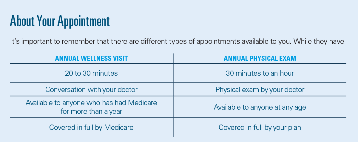 An annual wellness visit (AWV) is one of your best tools for staying on top of your health. It gives you time to talk with your doctor about your health risks and learn ways to stay healthy and injury free.